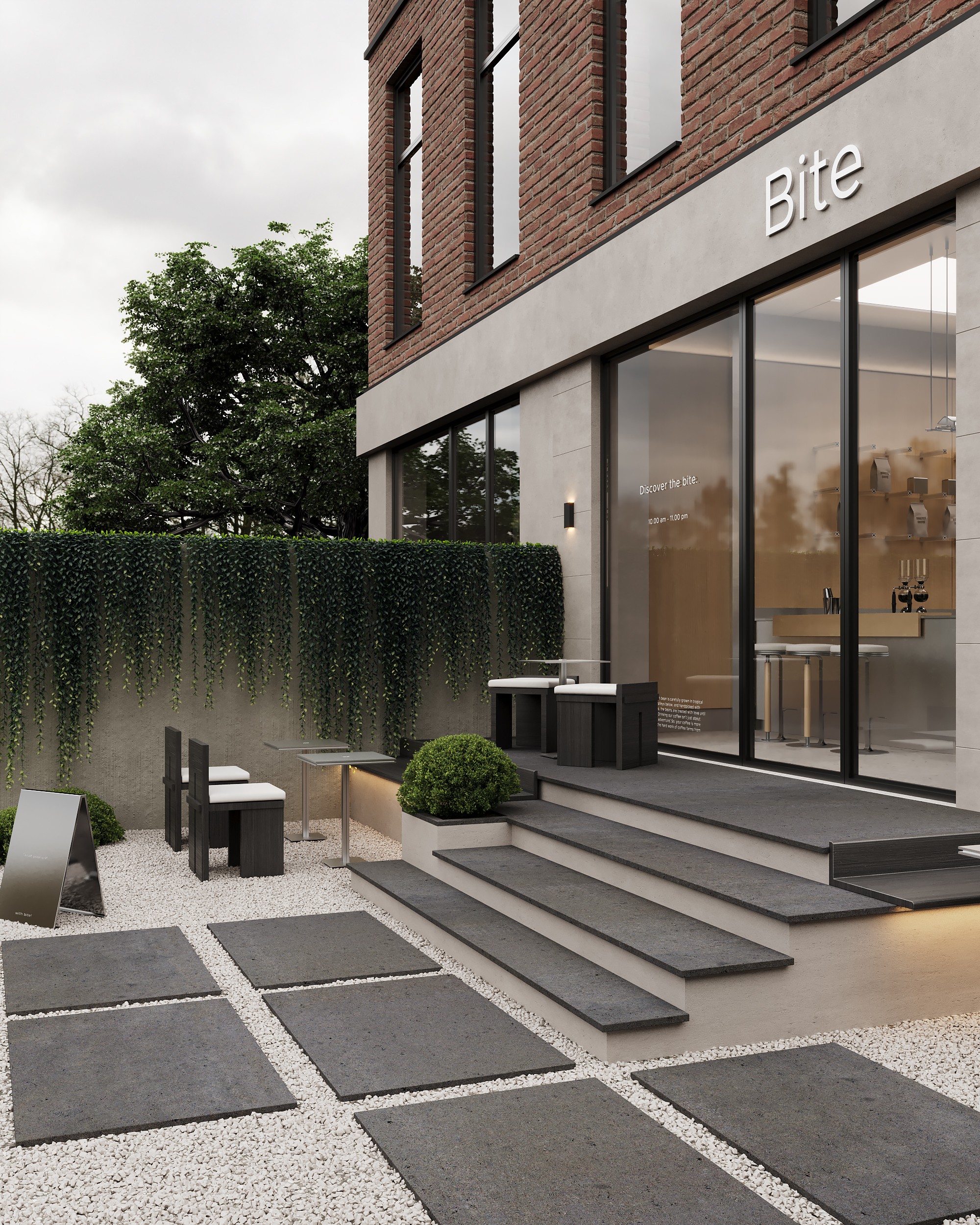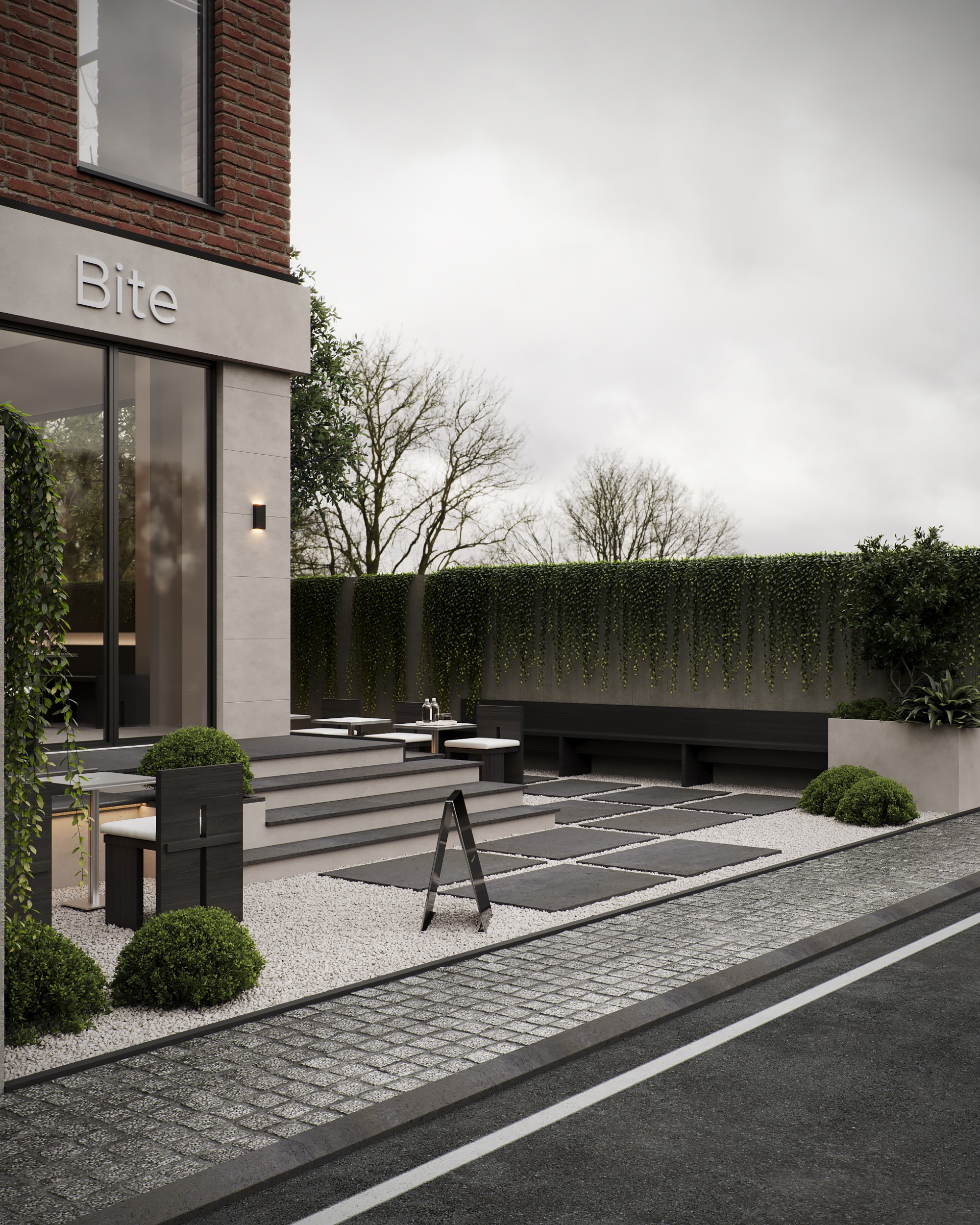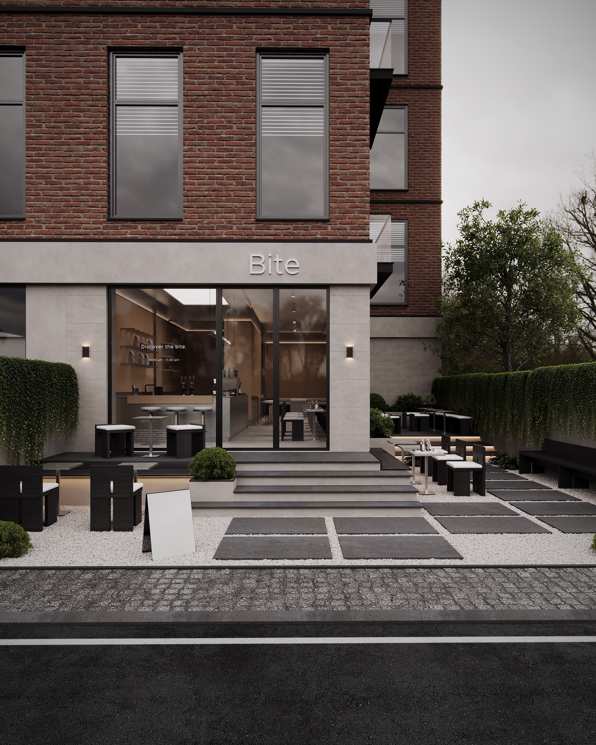 Bite is a café design project developed with a focus on minimal material expression and a clean spatial identity. The work involved the complete design and visualization of both the interior and exterior areas, creating a cohesive atmosphere that reflects the brand’s calm and refined character.