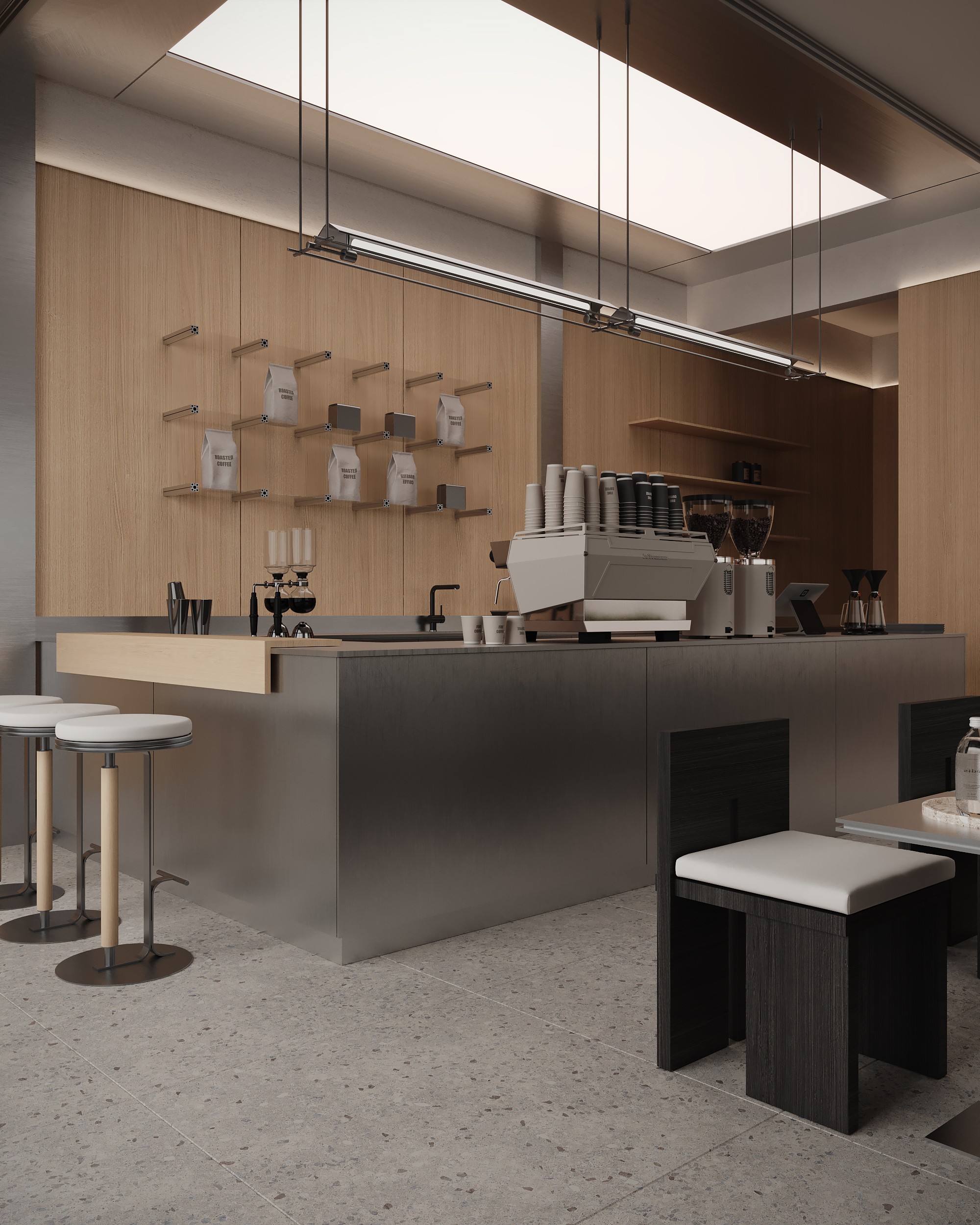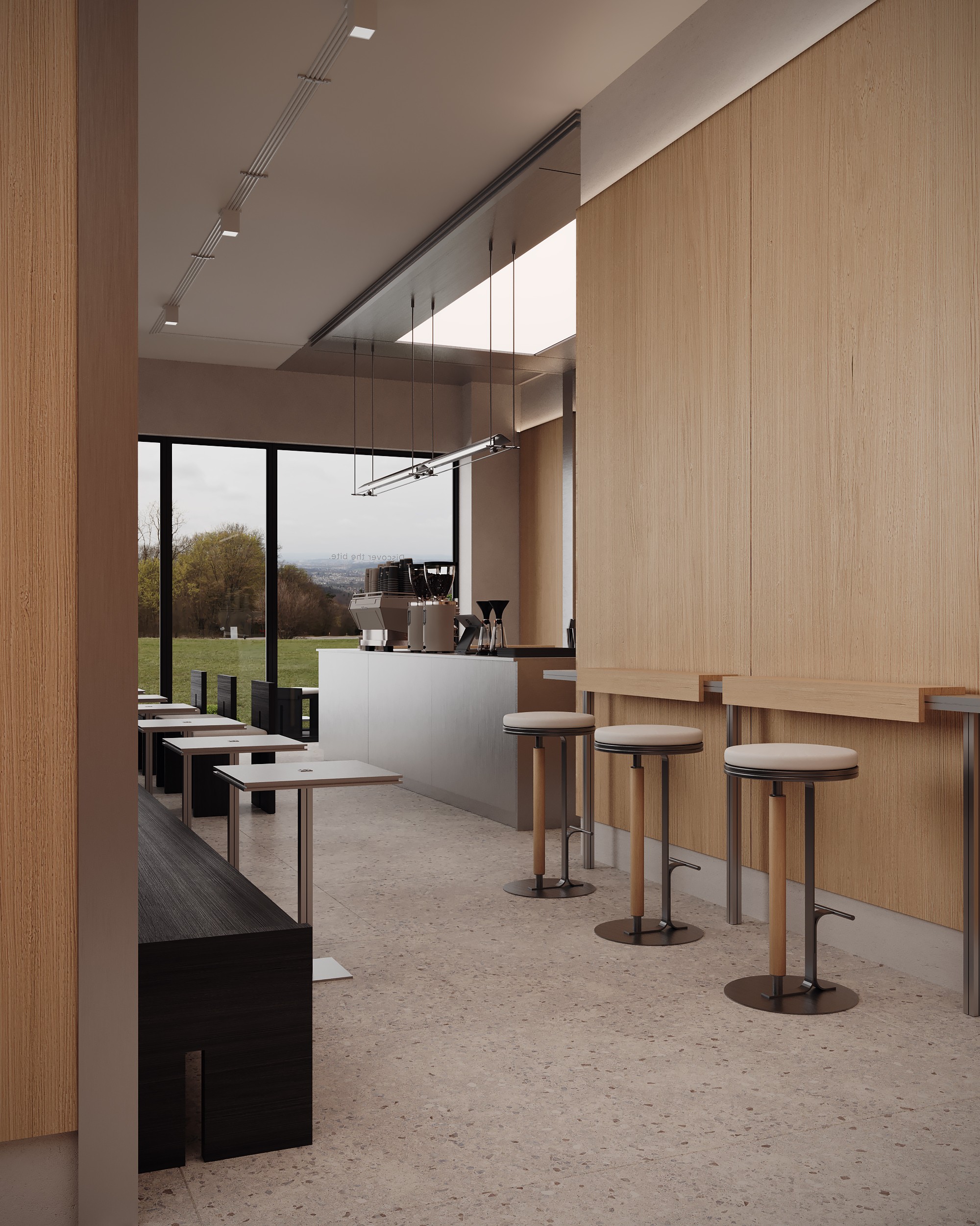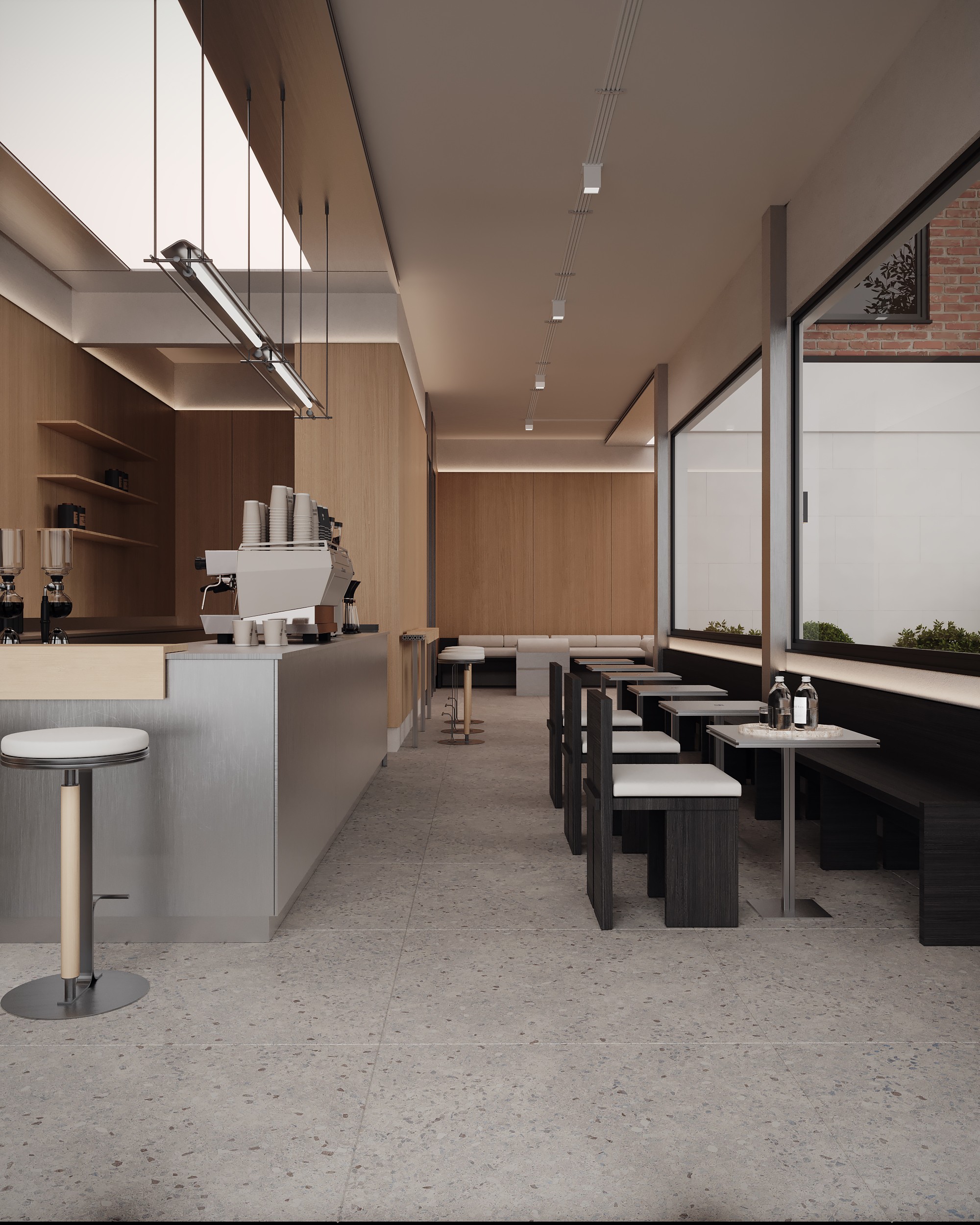 Concept Development:Established a minimalist design direction centered on calm tones, natural materials and geometric furniture forms to create a recognizable brand atmosphere. Spatial Planning:Optimized the layout to accommodate indoor seating, bar service and an exterior terrace. Ensured fluid movement between areas while maintaining spatial efficiency. Material & Lighting Direction:Used warm wood surfaces, textured stone elements and muted colors to support a serene mood. Combined natural light with soft indirect lighting to enhance depth and comfort. Furniture & Detailing:Designed custom seating, benches and outdoor arrangements to reinforce the café’s visual identity. Prioritized durability and clean lines. Visualization:Produced interior and exterior renders that highlight the harmony between the café’s architectural shell, landscaping elements and furnishing system.