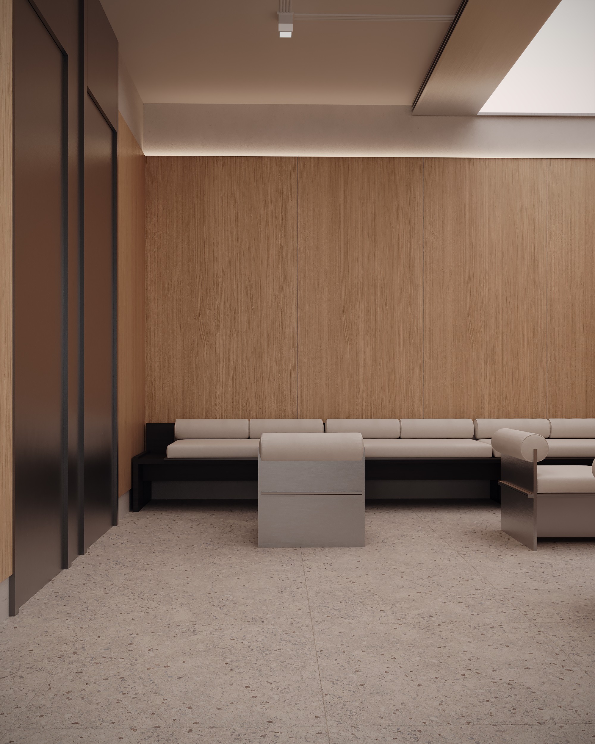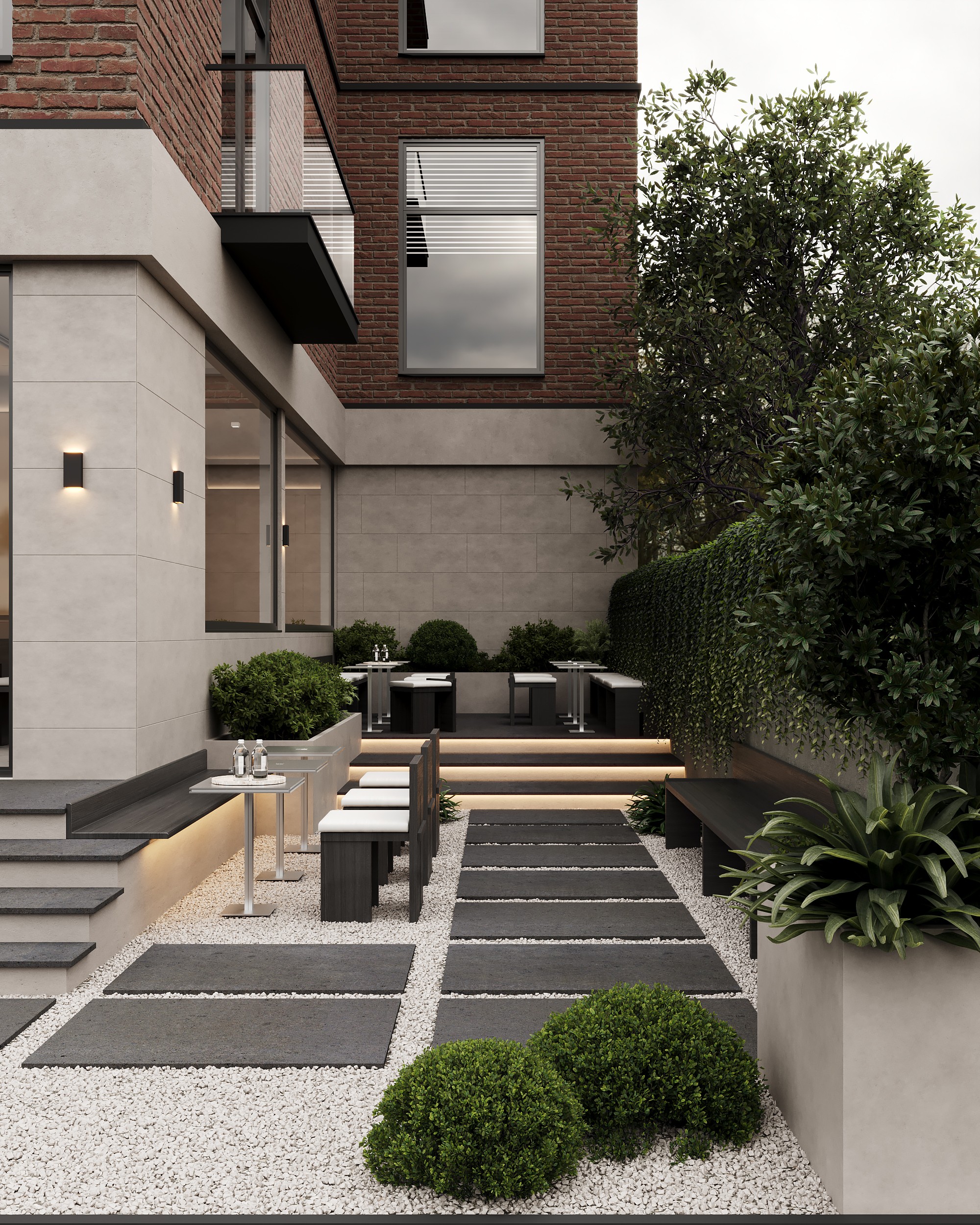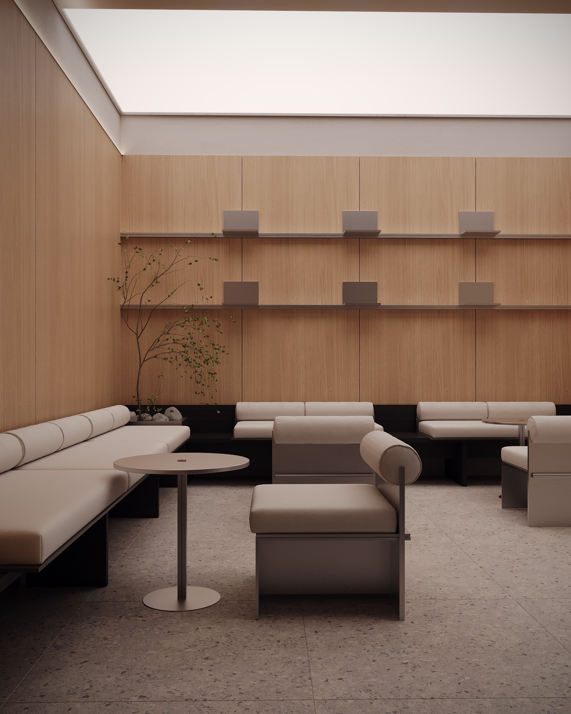 Concept Development:Established a minimalist design direction centered on calm tones, natural materials and geometric furniture forms to create a recognizable brand atmosphere. Spatial Planning:Optimized the layout to accommodate indoor seating, bar service and an exterior terrace. Ensured fluid movement between areas while maintaining spatial efficiency. Material & Lighting Direction:Used warm wood surfaces, textured stone elements and muted colors to support a serene mood. Combined natural light with soft indirect lighting to enhance depth and comfort. Furniture & Detailing:Designed custom seating, benches and outdoor arrangements to reinforce the café’s visual identity. Prioritized durability and clean lines. Visualization:Produced interior and exterior renders that highlight the harmony between the café’s architectural shell, landscaping elements and furnishing system.