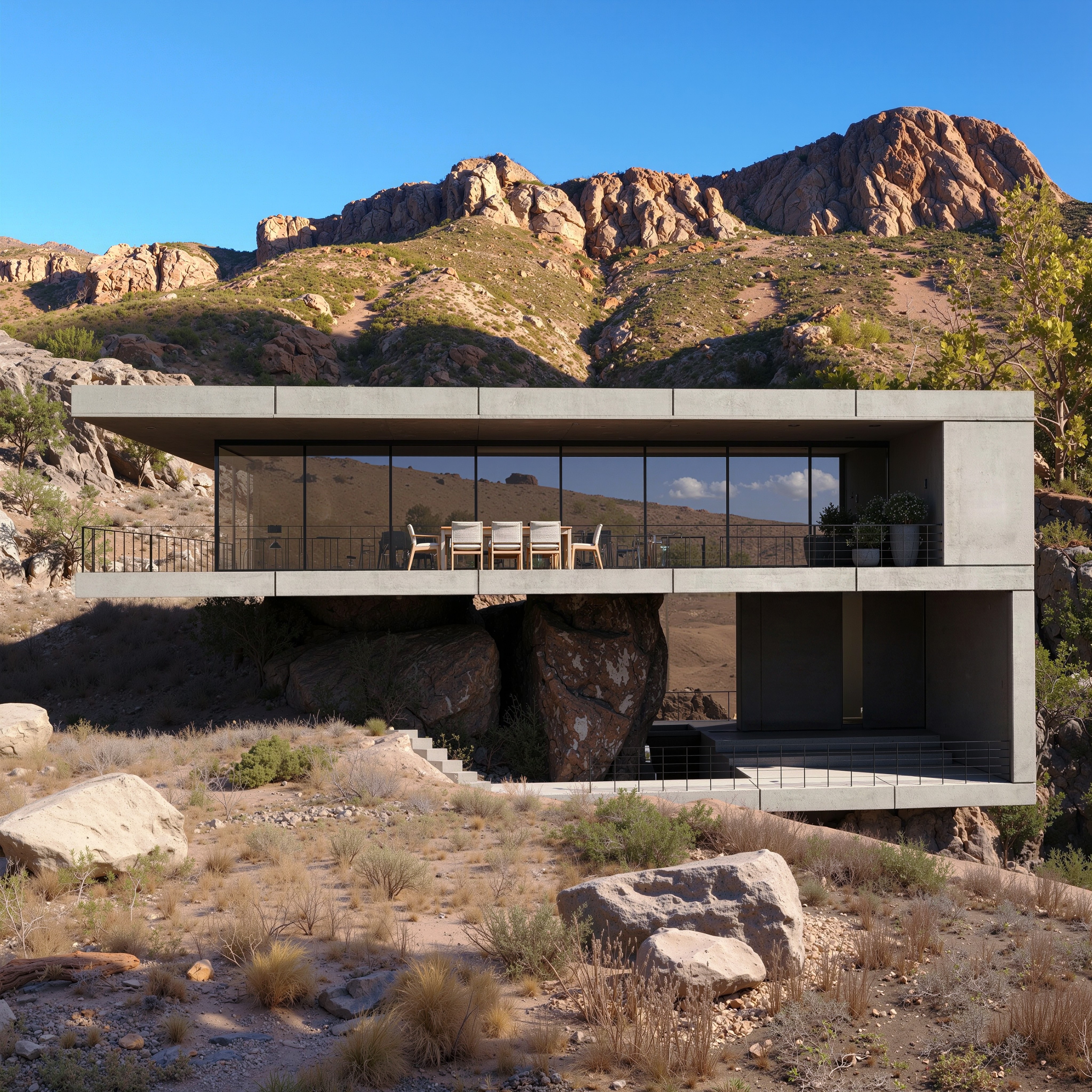 The main challenge was placing a two-level structure on an irregular rocky terrain without excavating or reshaping the site. Ensuring structural stability on existing boulders, controlling solar exposure in an open valley and preserving uninterrupted panoramic views required a careful balance between engineering and spatial clarity.