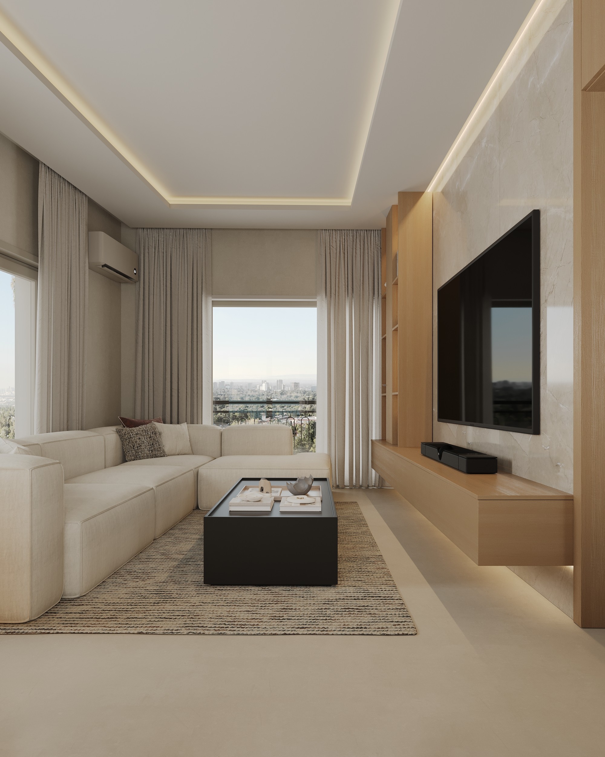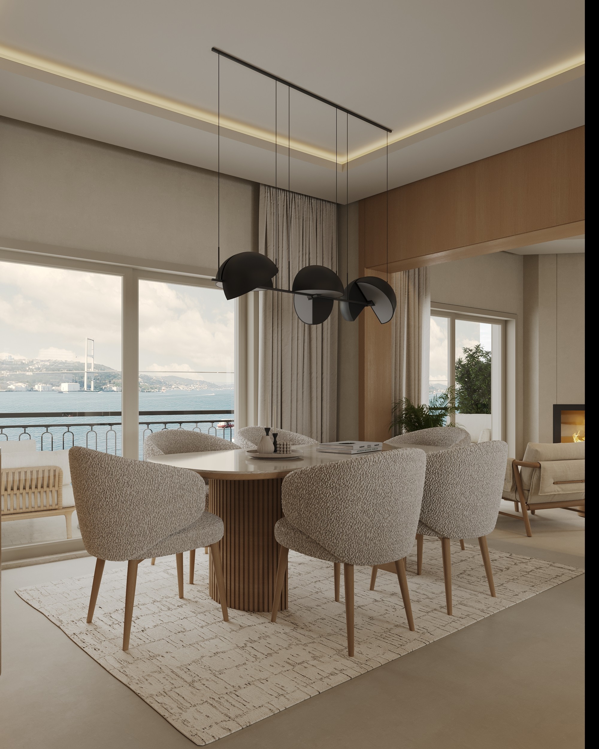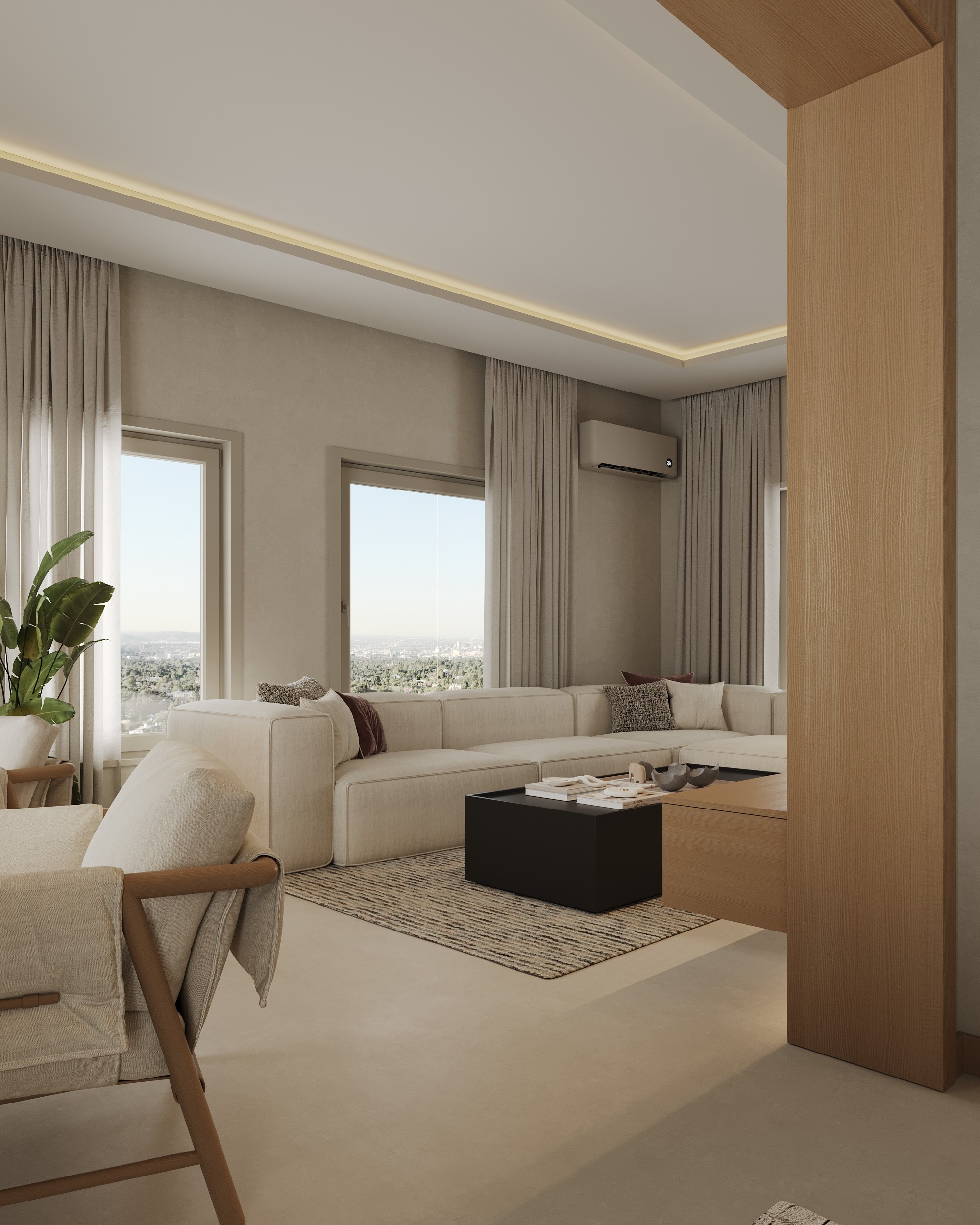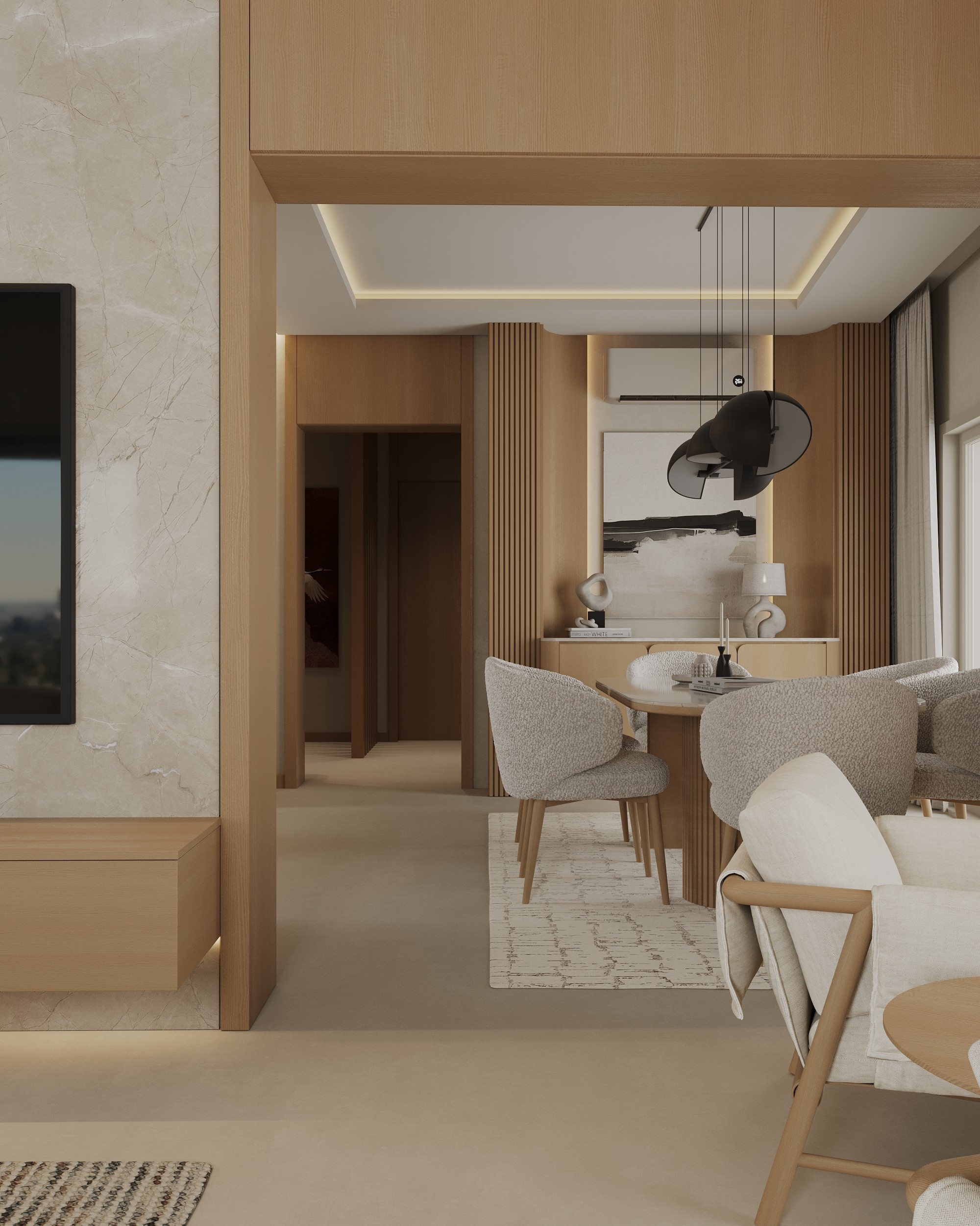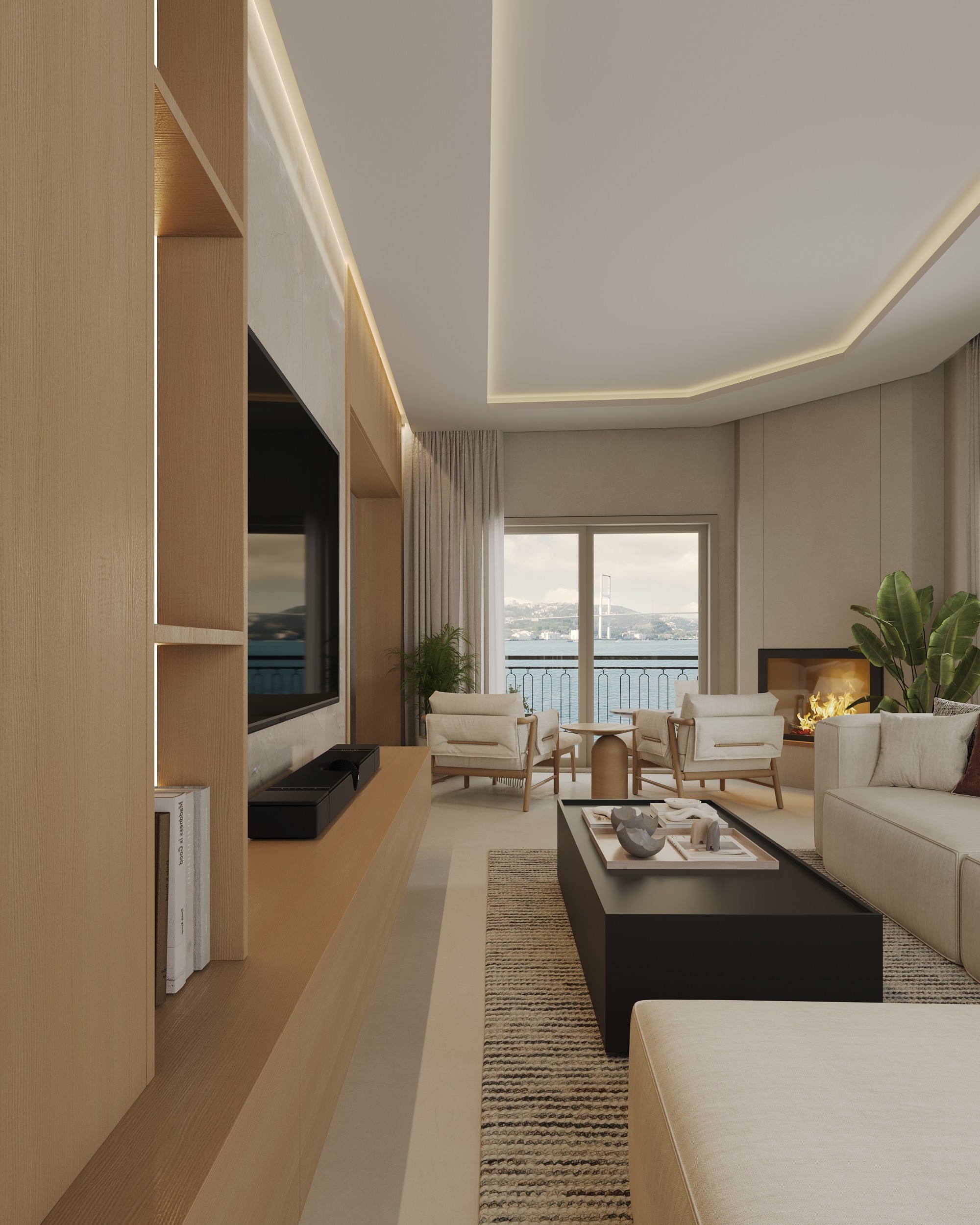 R.B.E Apartment is a private home located in Emirgan, Istanbul. The project involved the complete interior design and visualization of the apartment. All spaces, including the living area, kitchen, bedrooms, dressing room, bathrooms, corridor and terrace, were designed with a cohesive and calm aesthetic. The goal was to create a balanced atmosphere built on material harmony and functional clarity.