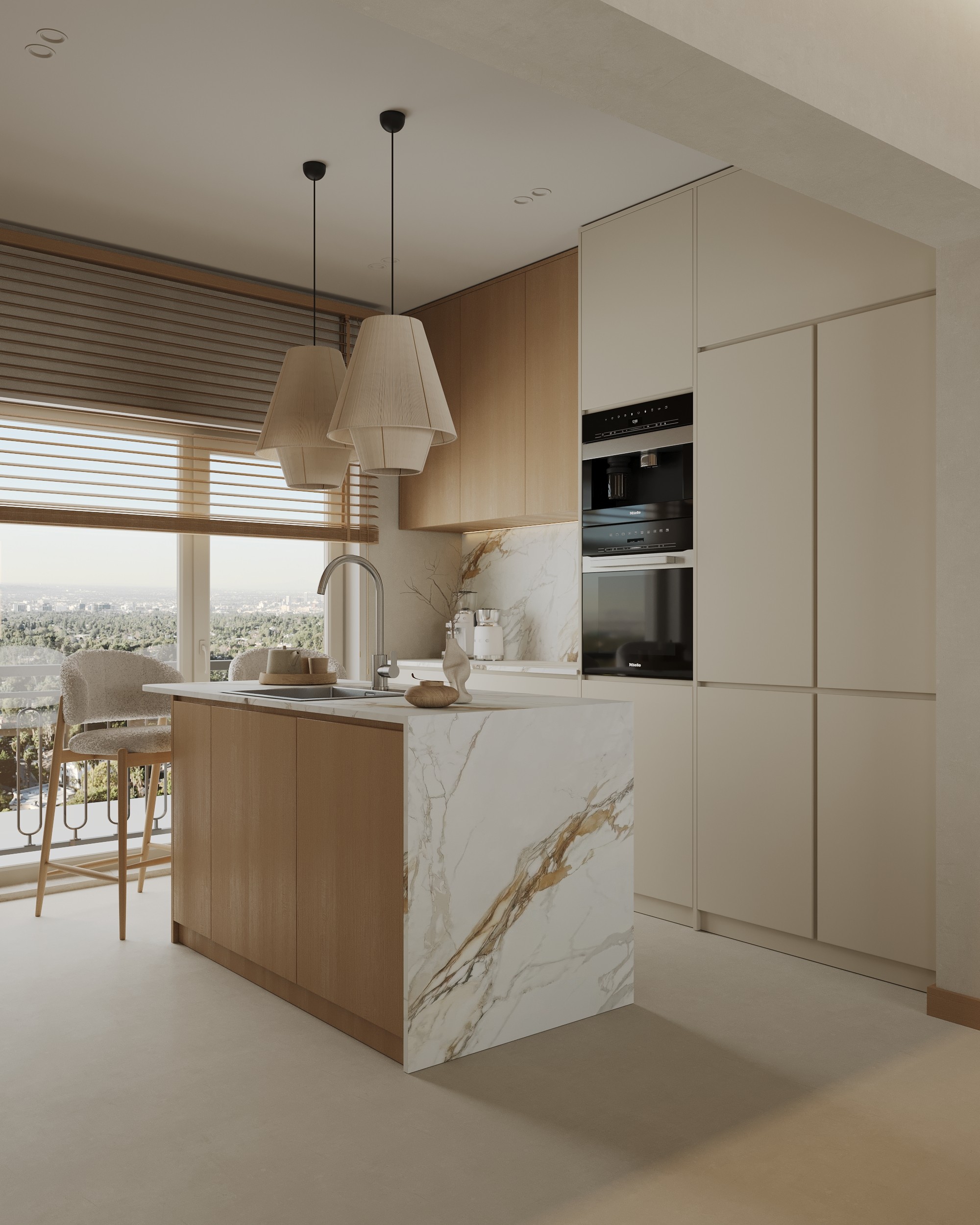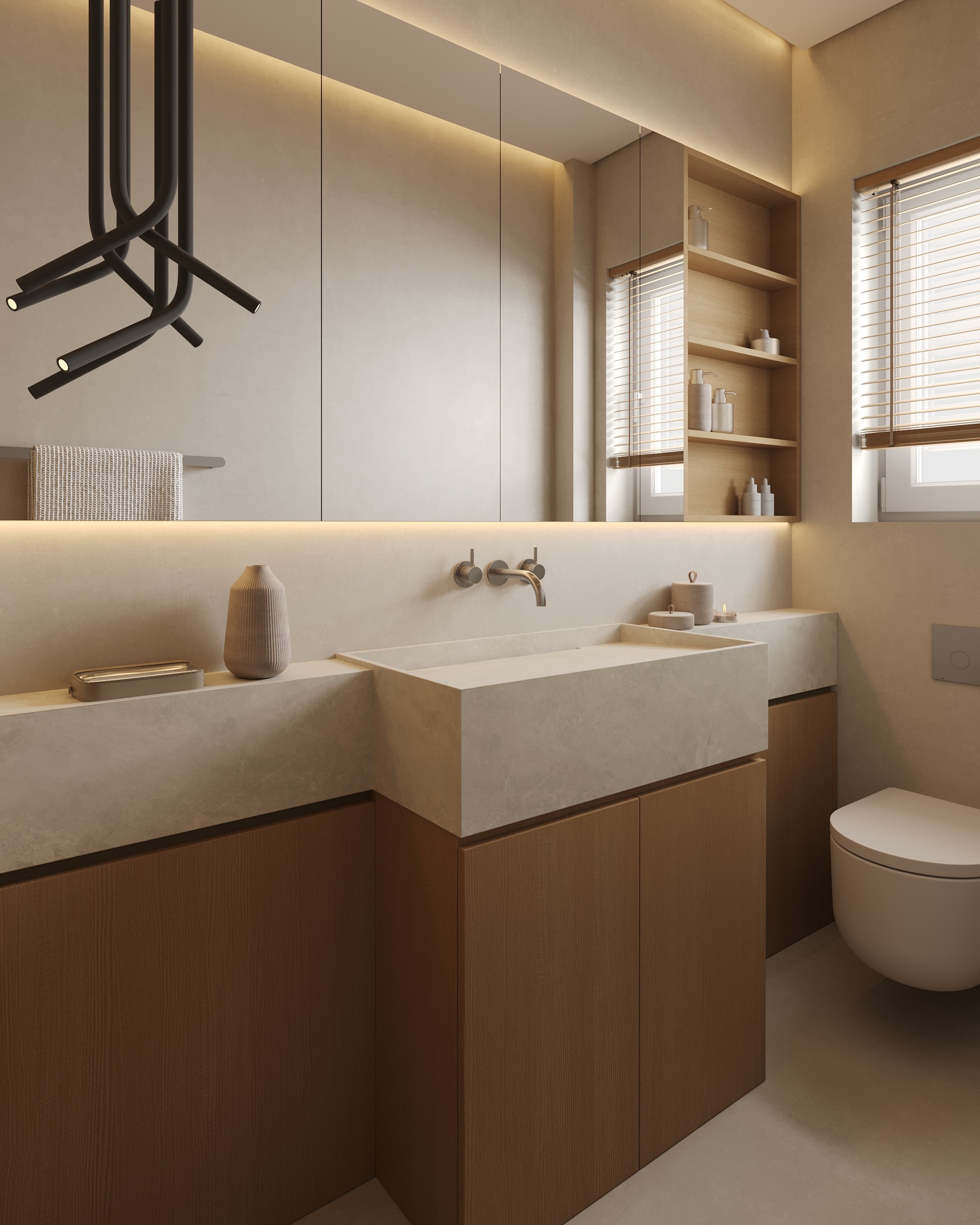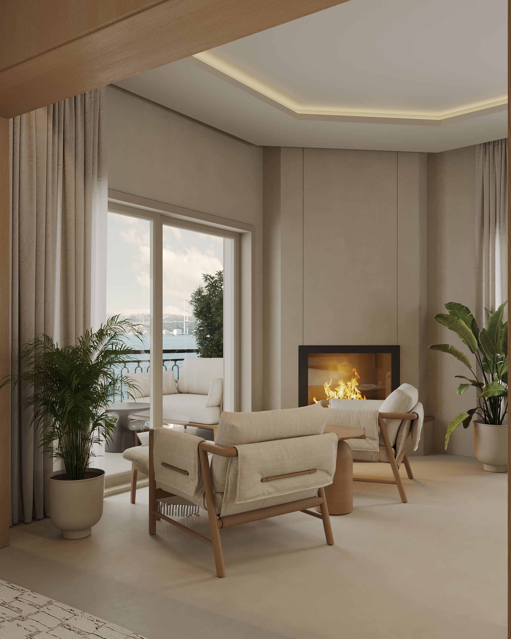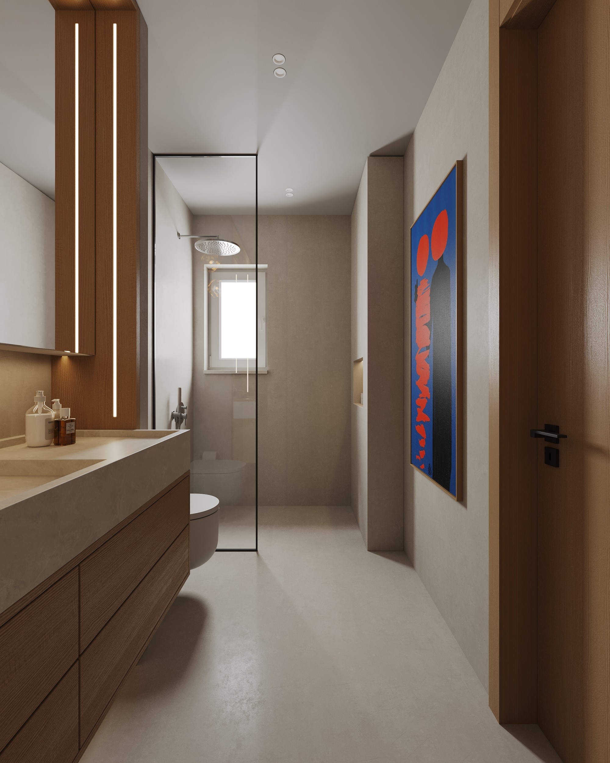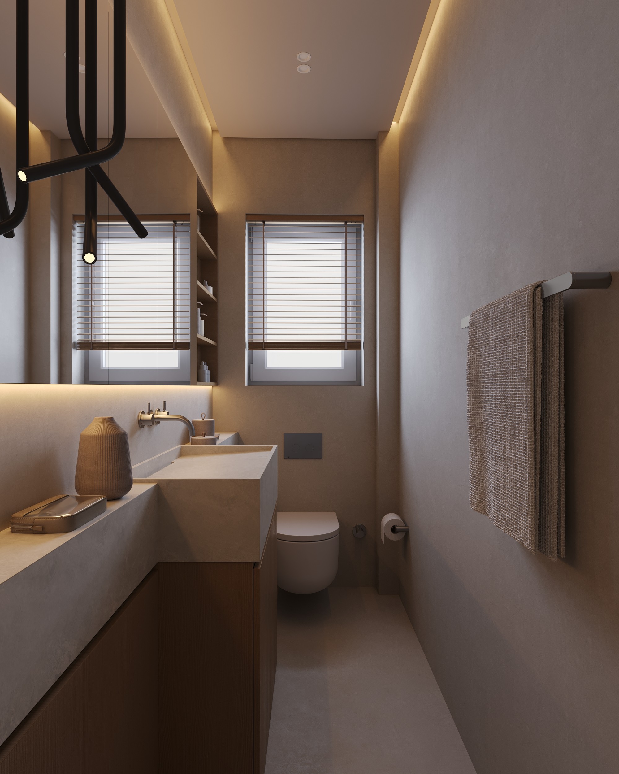 R.B.E Apartment is a private home located in Emirgan, Istanbul. The project involved the complete interior design and visualization of the apartment. All spaces, including the living area, kitchen, bedrooms, dressing room, bathrooms, corridor and terrace, were designed with a cohesive and calm aesthetic. The goal was to create a balanced atmosphere built on material harmony and functional clarity.