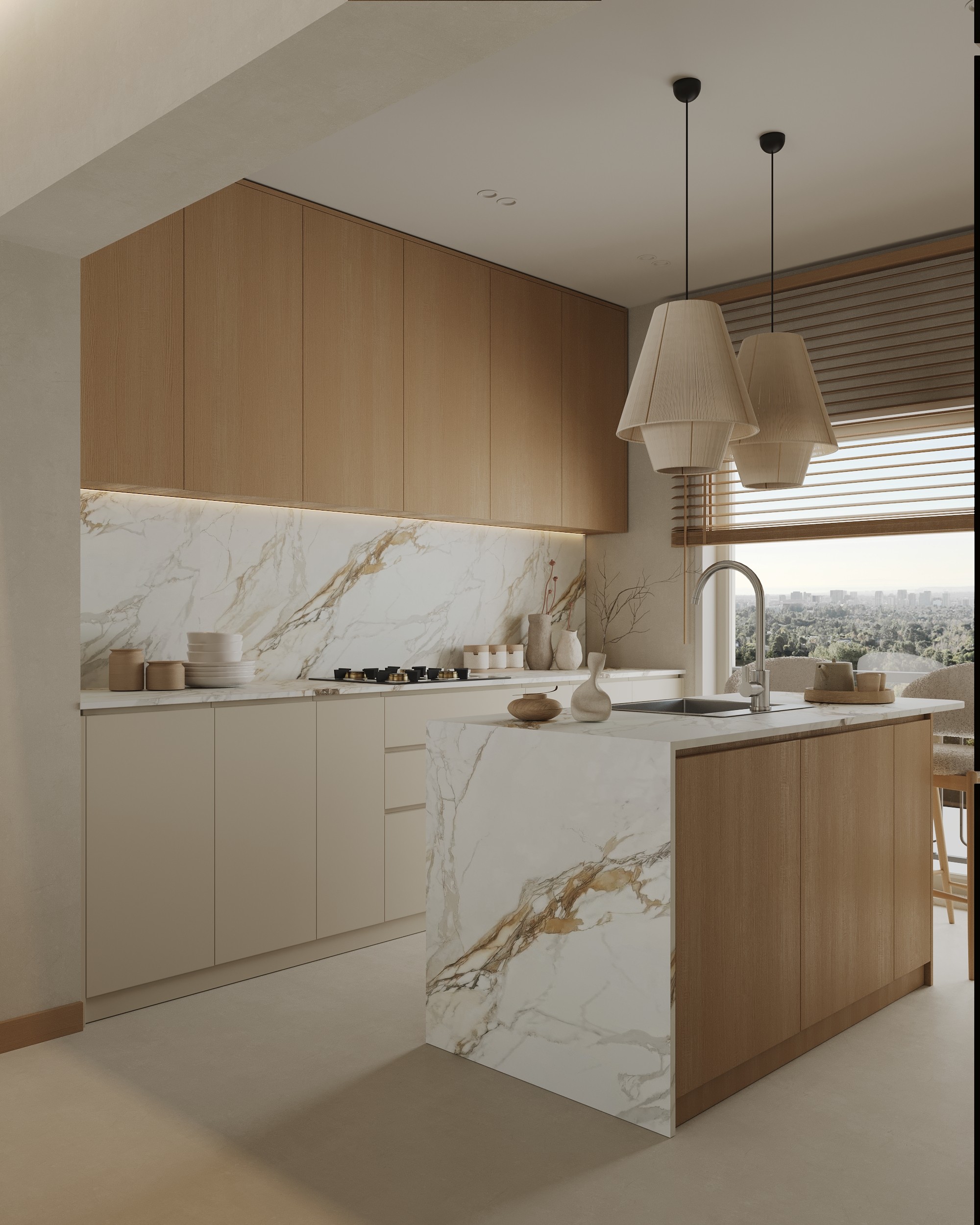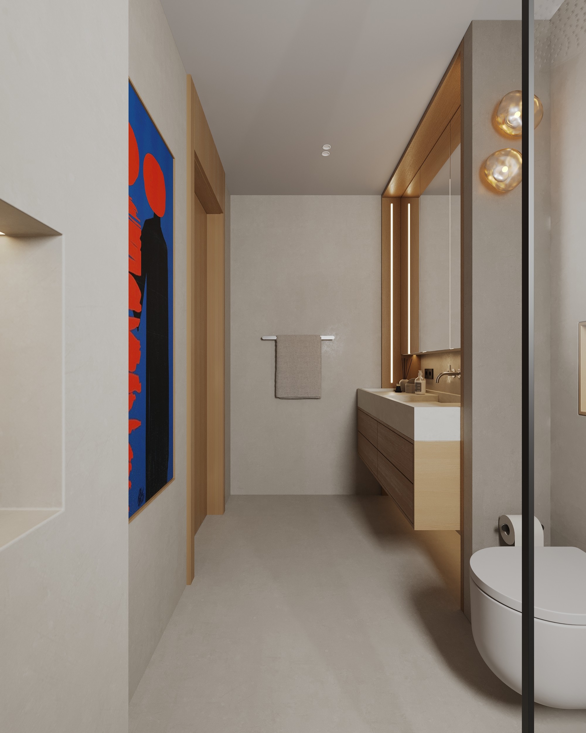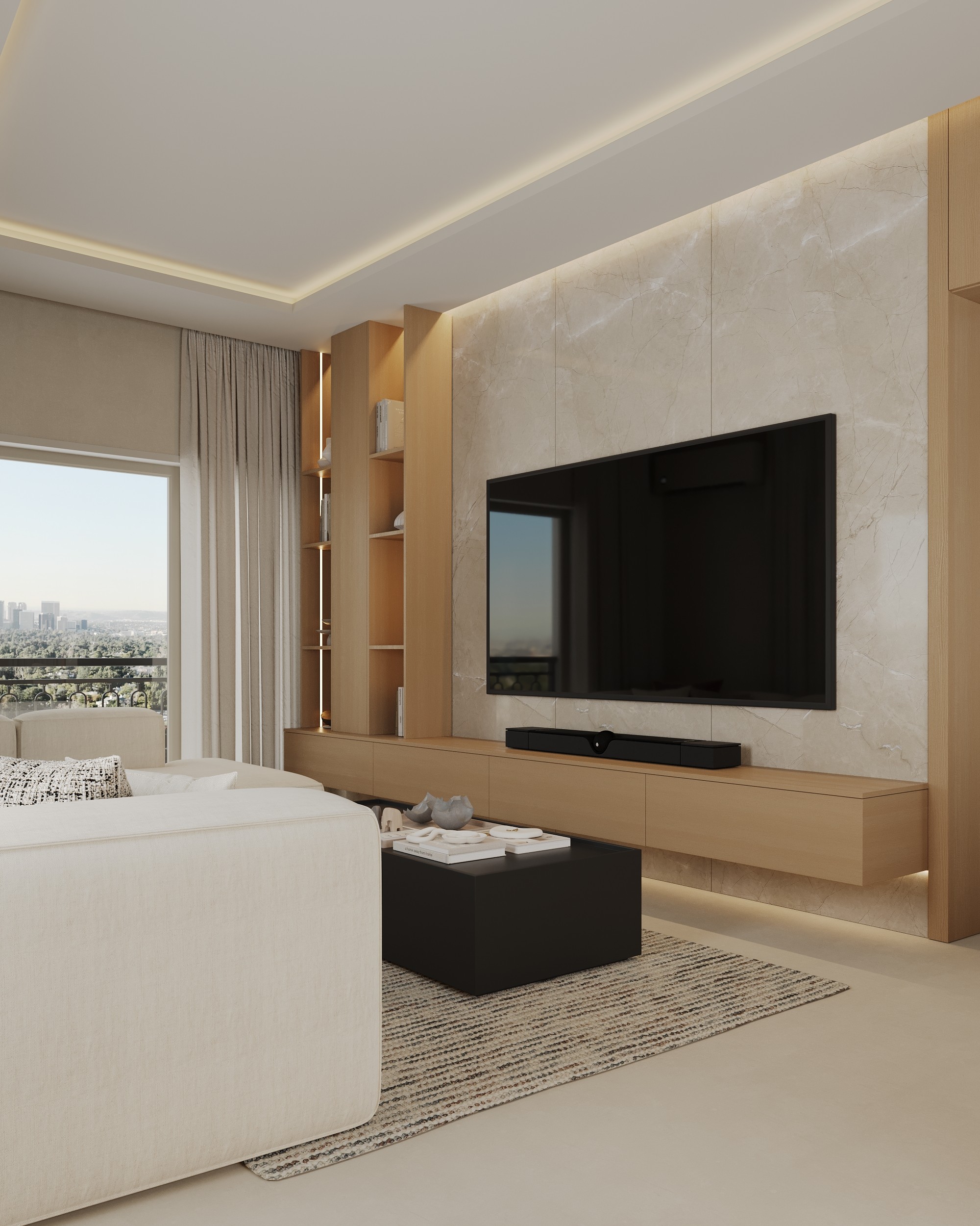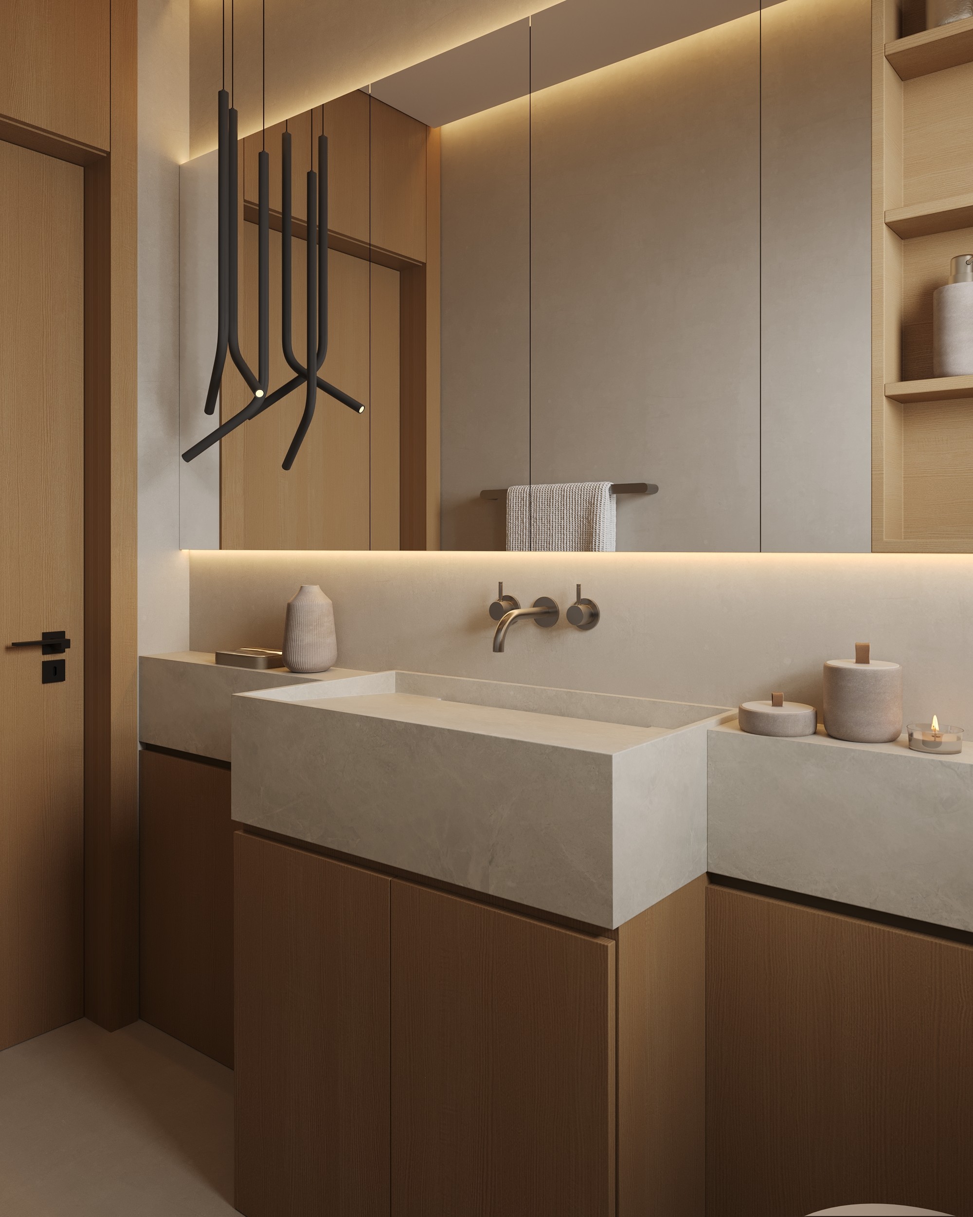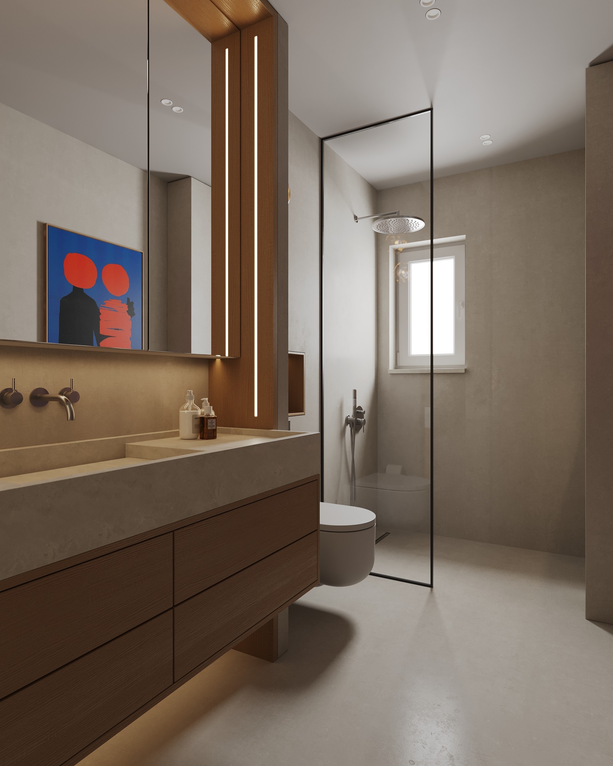 R.B.E Apartment is a private home located in Emirgan, Istanbul. The project involved the complete interior design and visualization of the apartment. All spaces, including the living area, kitchen, bedrooms, dressing room, bathrooms, corridor and terrace, were designed with a cohesive and calm aesthetic. The goal was to create a balanced atmosphere built on material harmony and functional clarity.