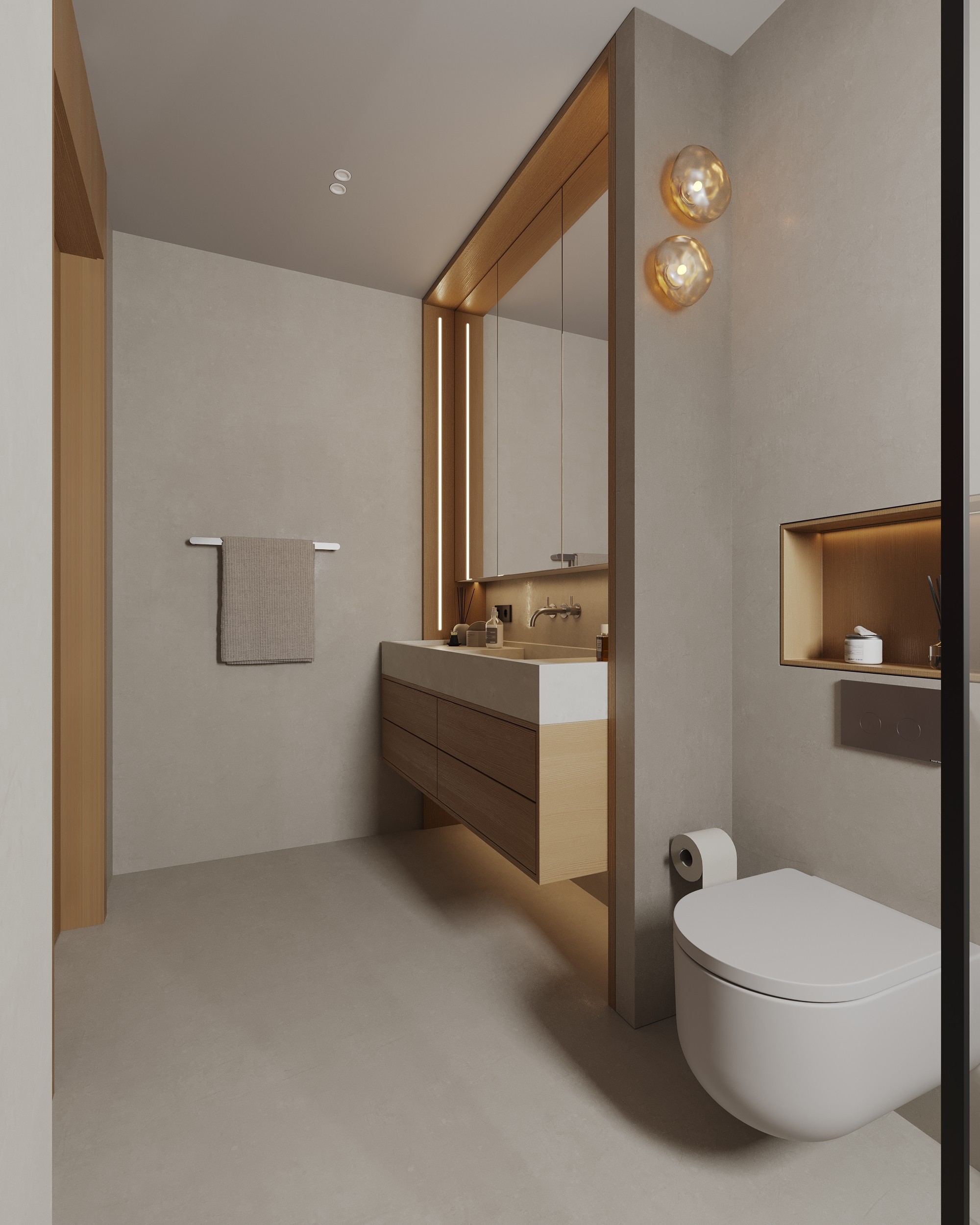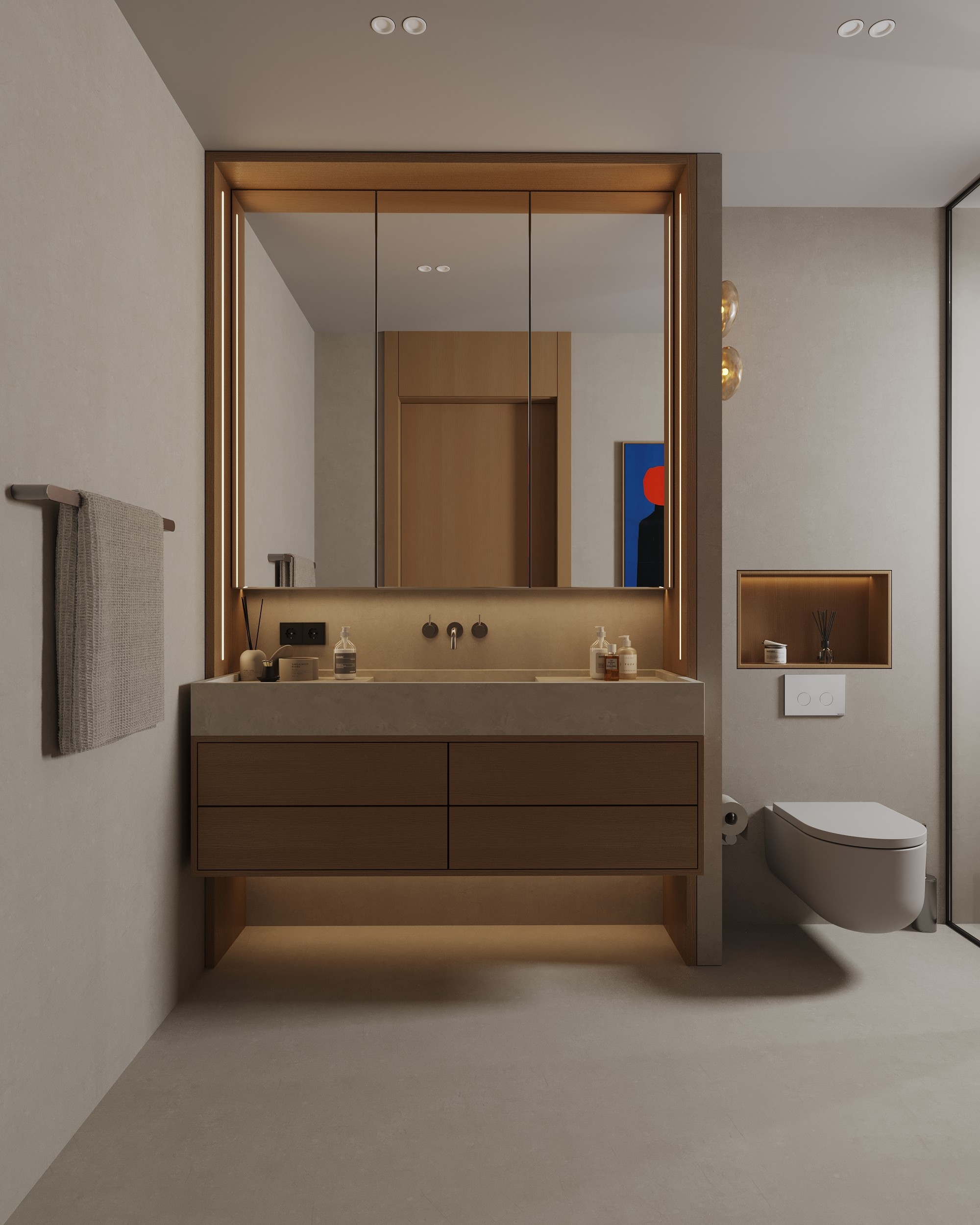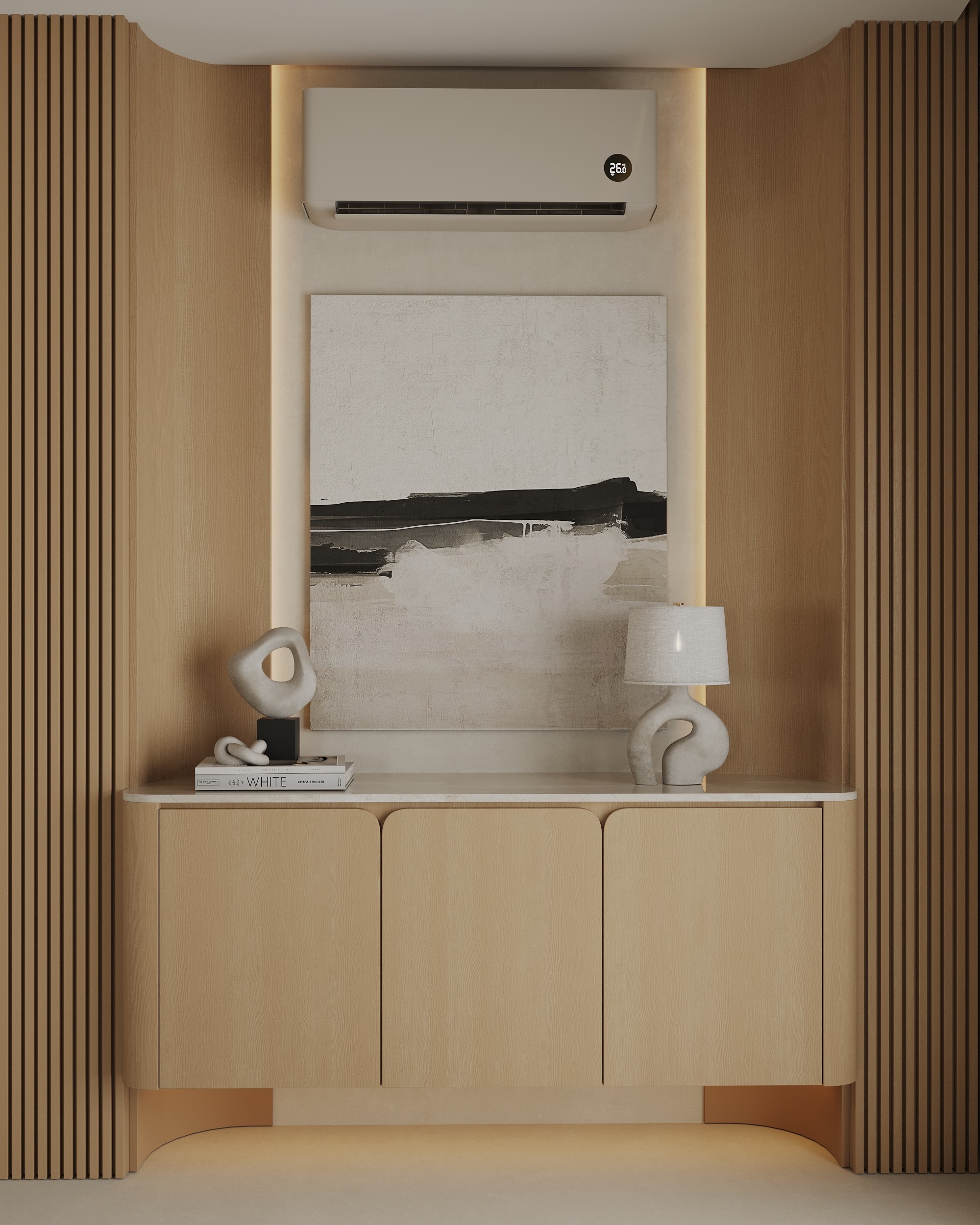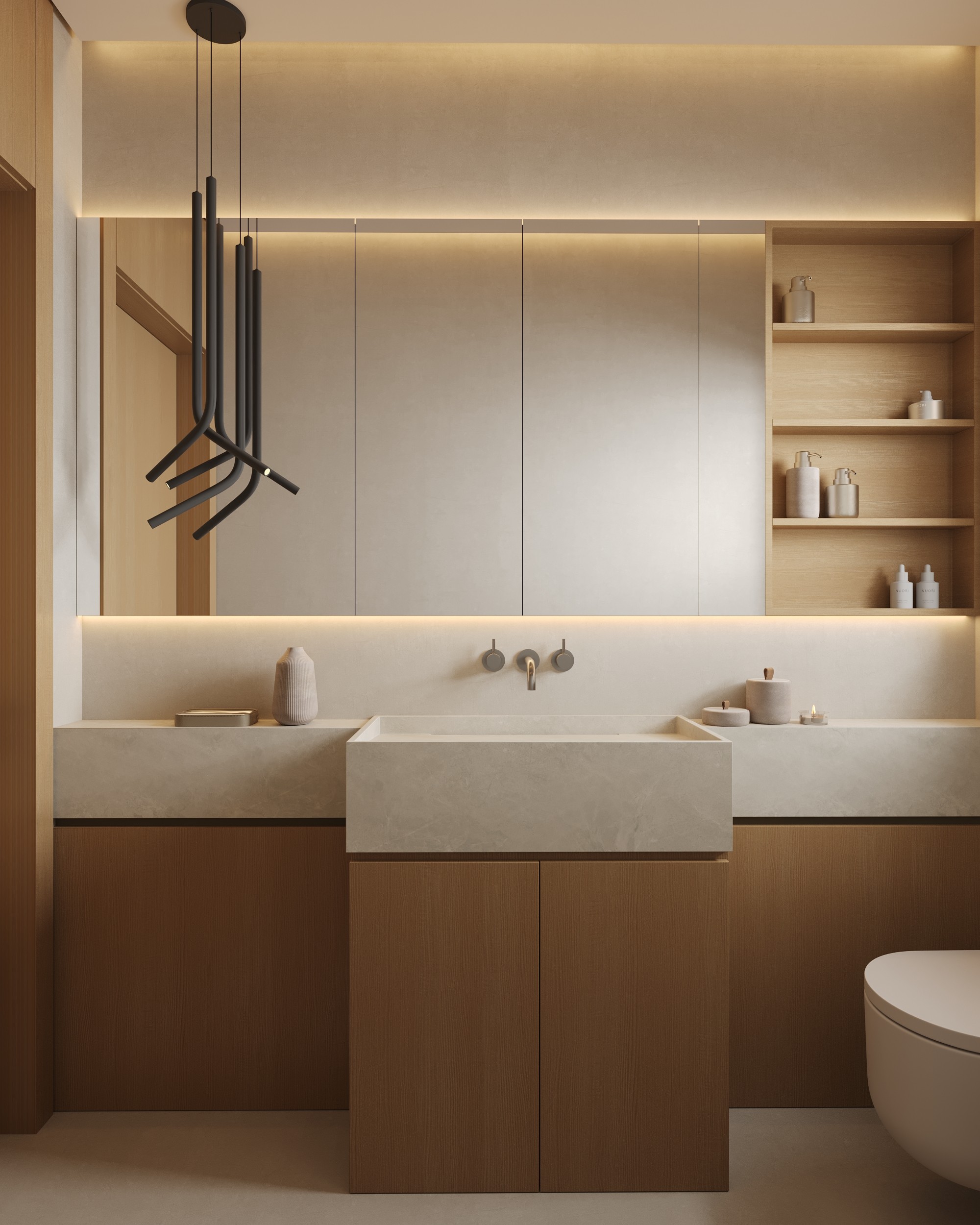 Spatial ReorganizationCirculation and functional zones were redefined. Built-in storage and recessed cabinetry were used to reduce visual clutter and optimize everyday use. Material StrategyA consistent palette of warm wood, soft neutrals and stone-textured surfaces was applied to create continuity and a calm overall character.
